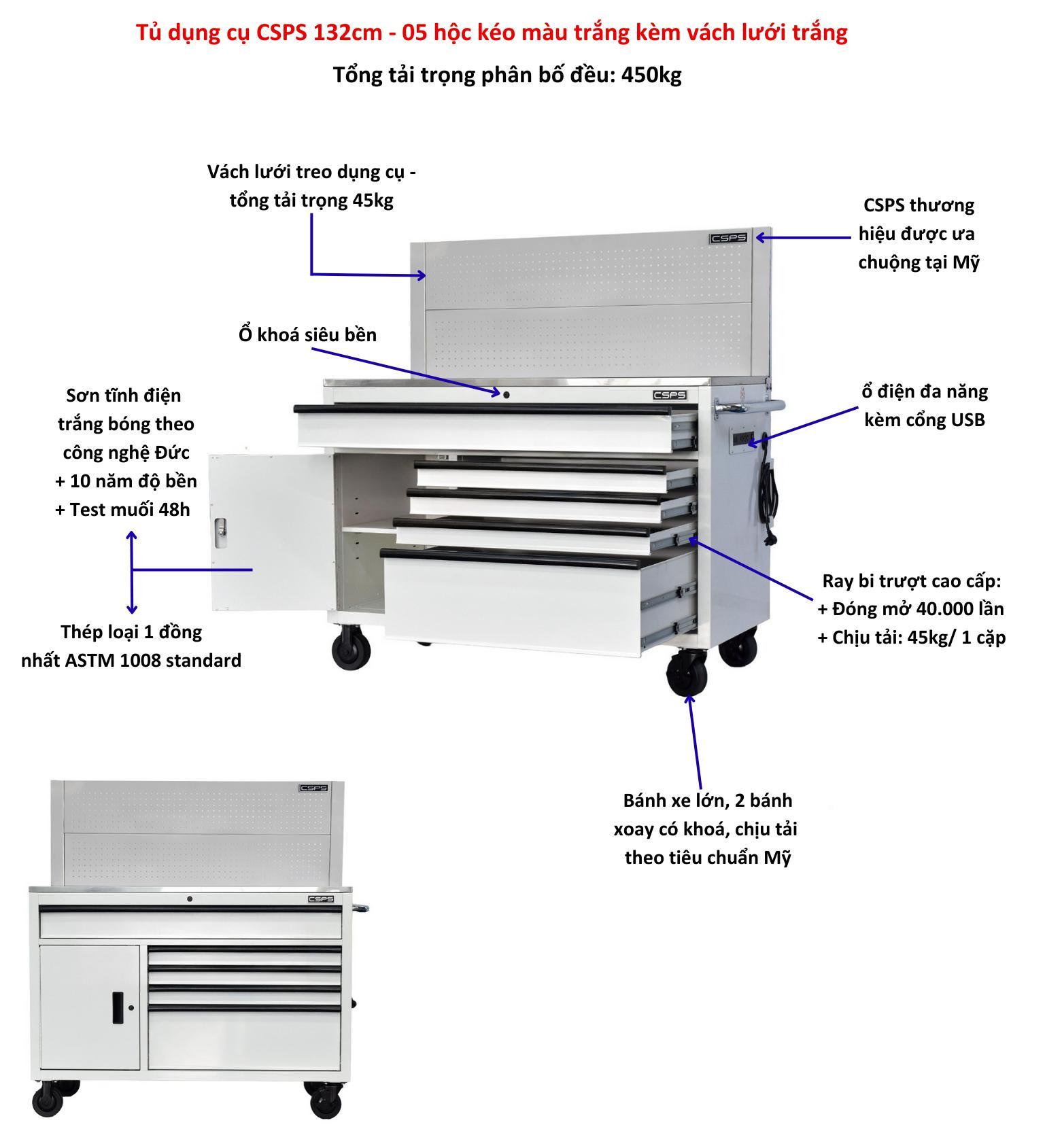 Tủ dụng cụ Tủ dụng cụ CSPS 132cm - 05 hộc kéo màu trắng là một thiết kế mới của CSPS dành riêng cho người thợ Việt Nam với các lợi ích nổi bật: / CSPS tool cabinet 132 cm – 05 drawers are a new design of CSPS specialized for Vietnamese with outstanding benefits: