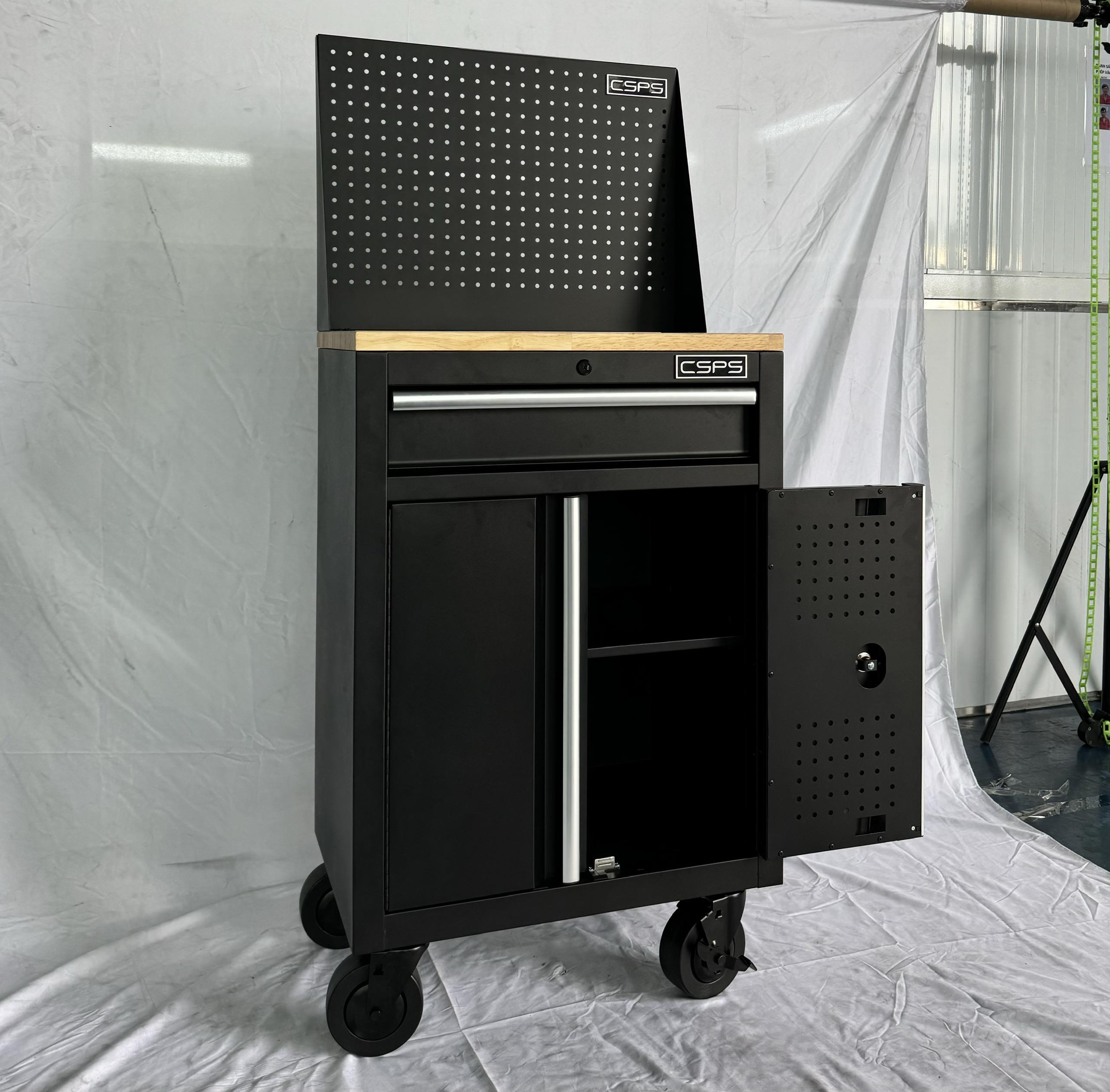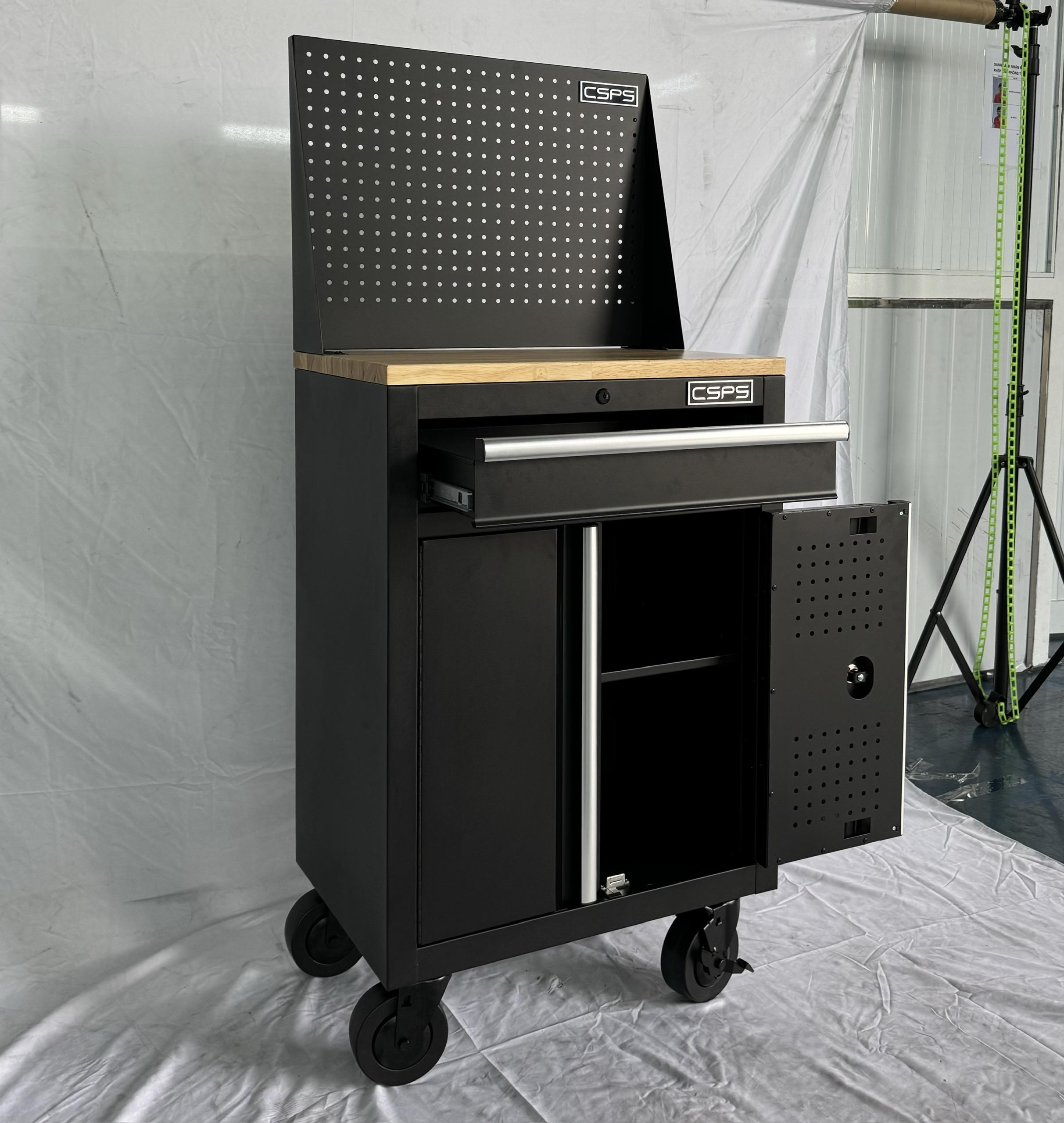 Tủ dụng cụ CSPS 61cm - 01 hộc kéo màu đen bánh xe ván gỗ vách lưới (tay cầm trắng)