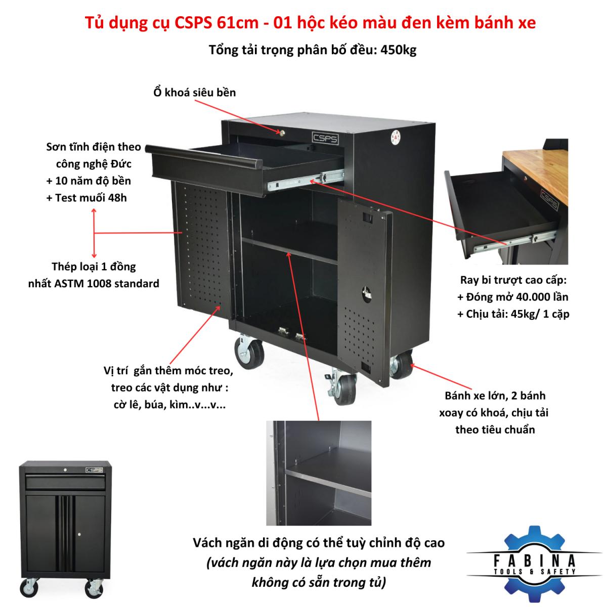 Tủ dụng cụ CSPS 61cm - 01 hộc kéo màu đen kèm bánh xe (tay cầm đen)
