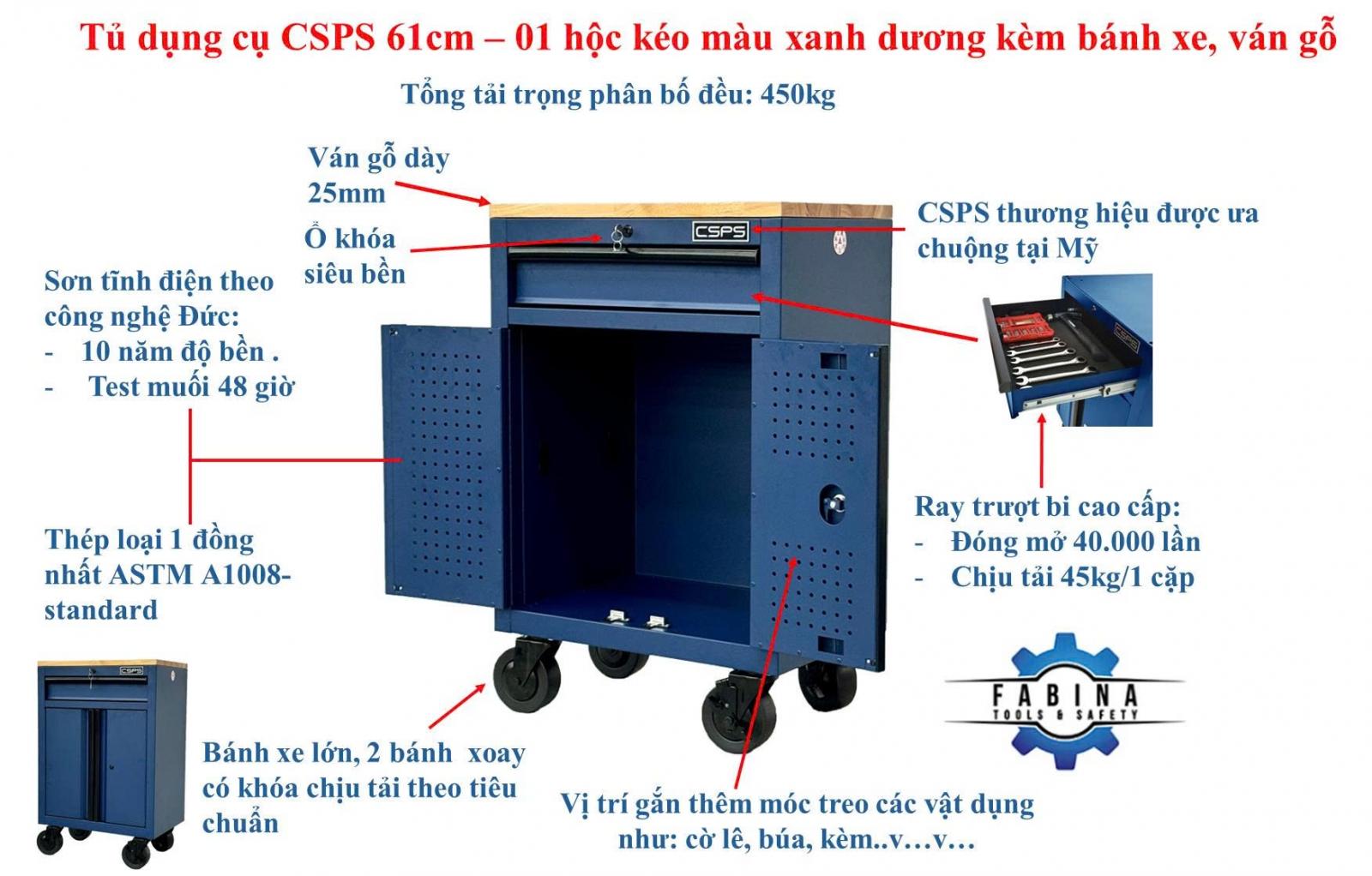 Tủ dụng cụ CSPS 61cm - 01 hộc kéo màu xanh dương có bánh xe & ván gỗ