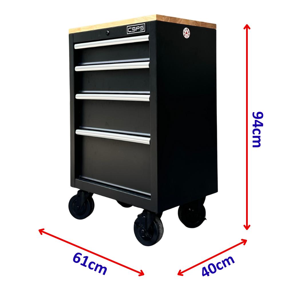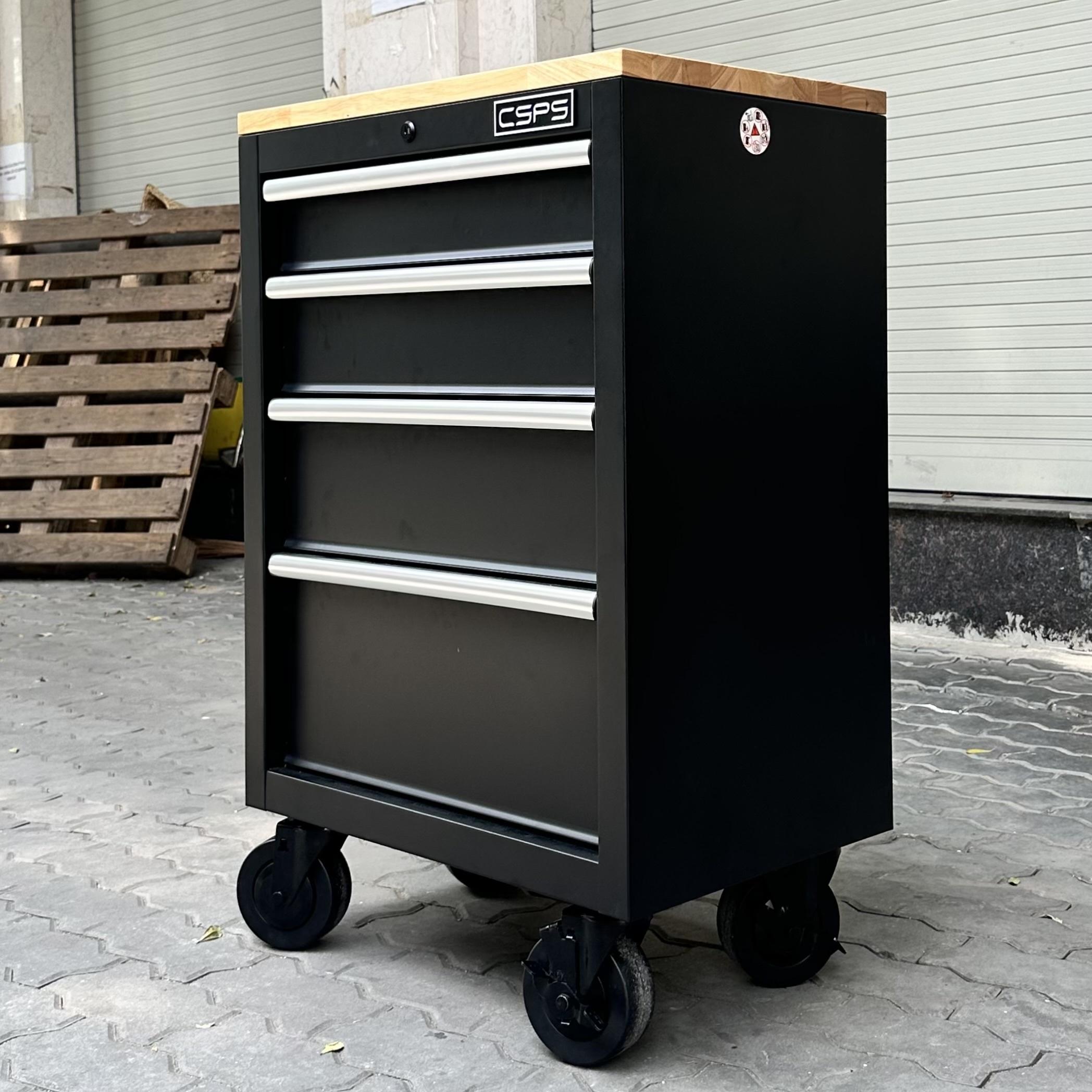 Tủ dụng cụ CSPS 61cm - 04 hộc kéo màu đen kèm bánh xe và ván gỗ (tay cầm trắng)