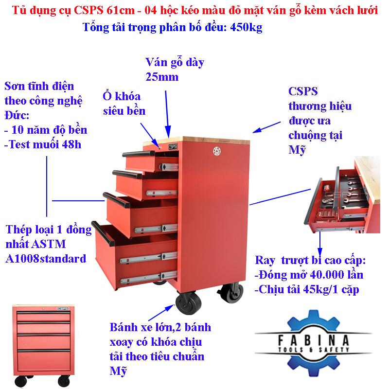 Tủ dụng cụ CSPS 61cm - 04 hộc kéo màu đỏ mặt ván gỗ