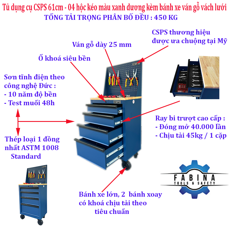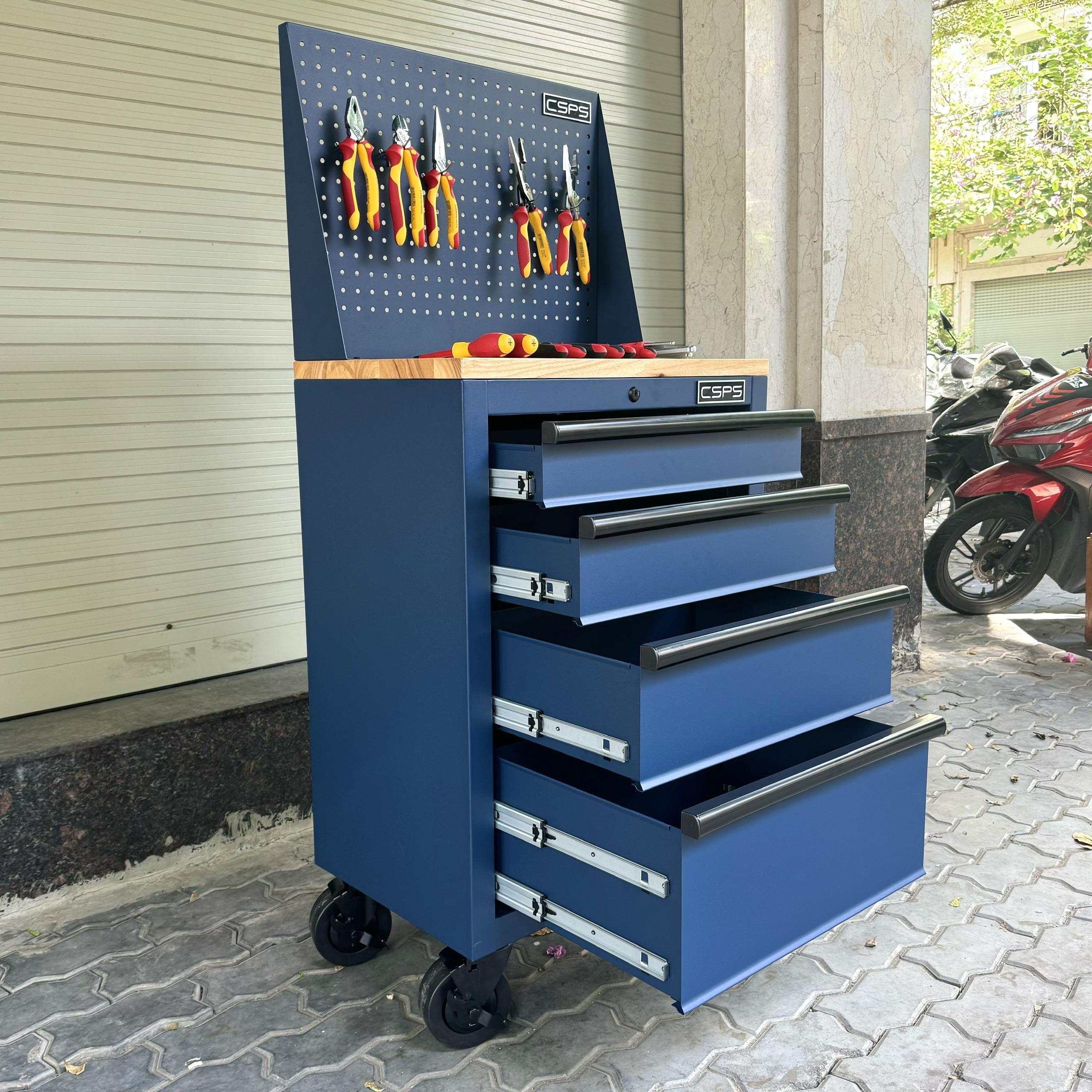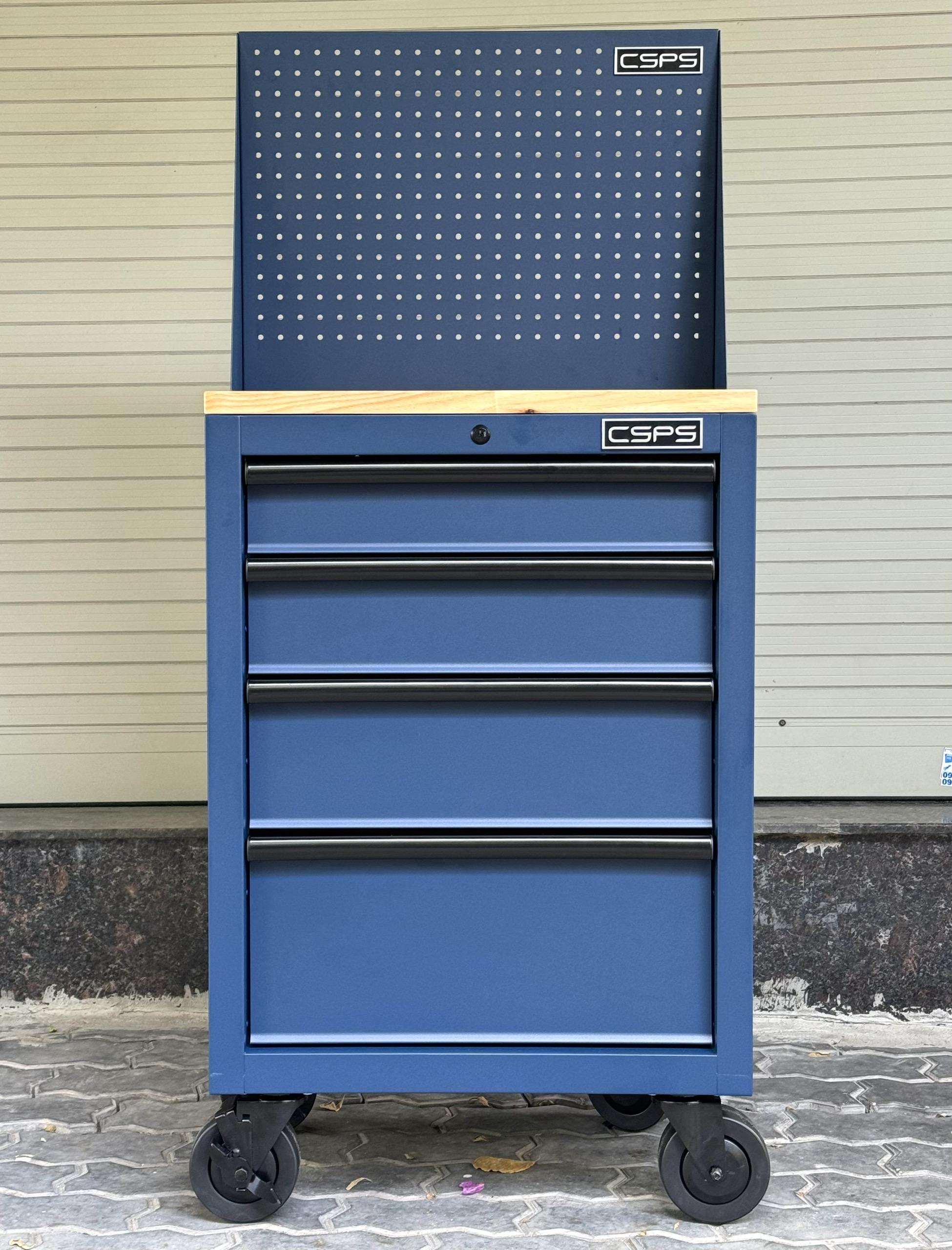 Tủ dụng cụ CSPS 61cm - 04 hộc kéo màu xanh dương kèm bánh xe ván gỗ vách lưới