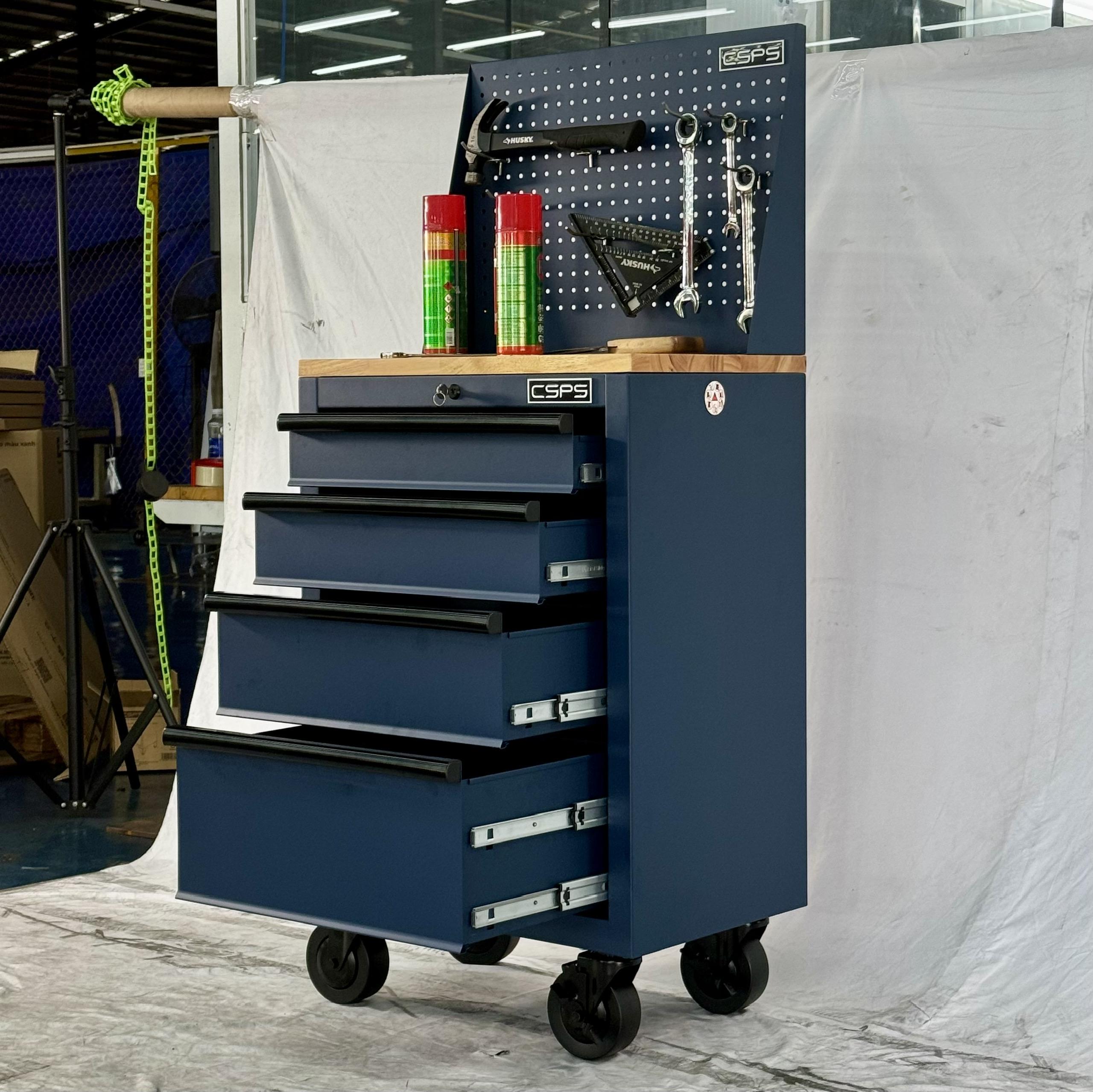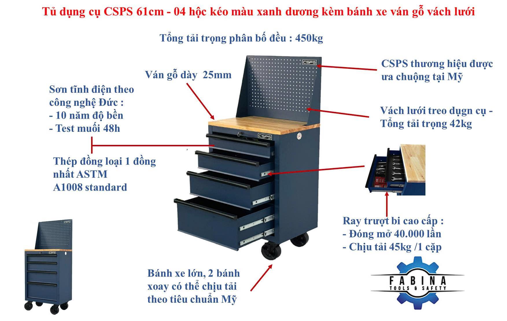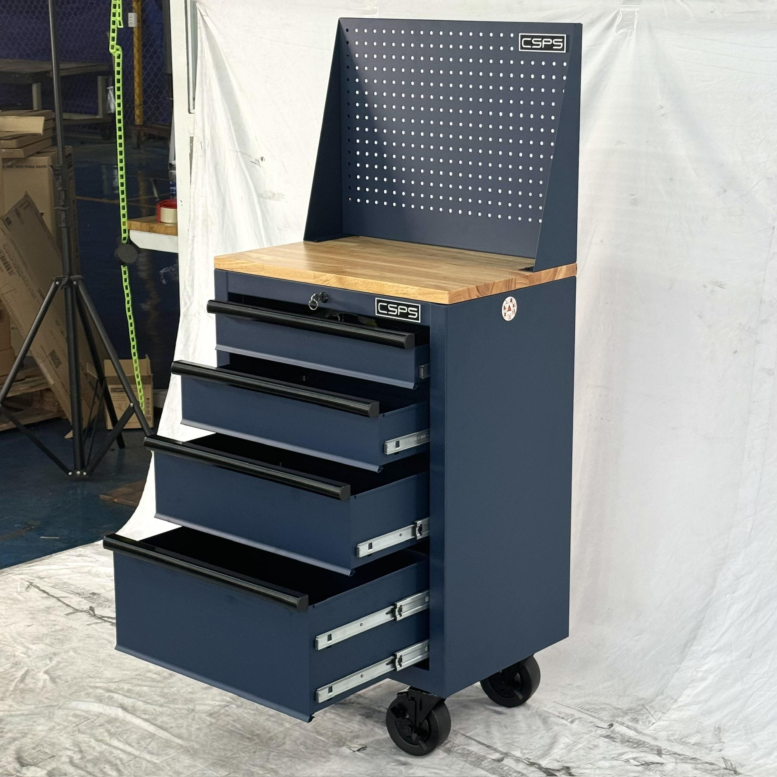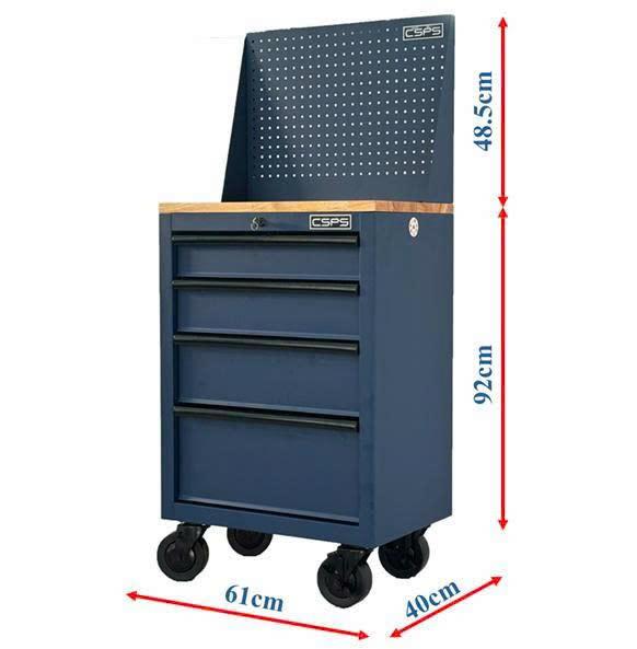 Tủ dụng cụ CSPS 61cm - 04 hộc kéo màu xanh dương kèm bánh xe ván gỗ vách lưới