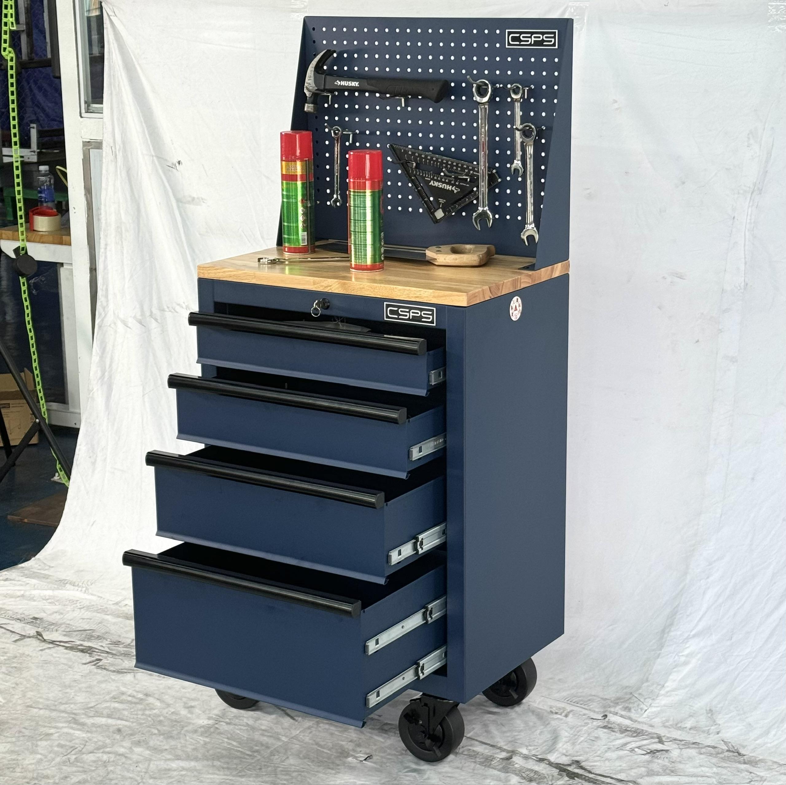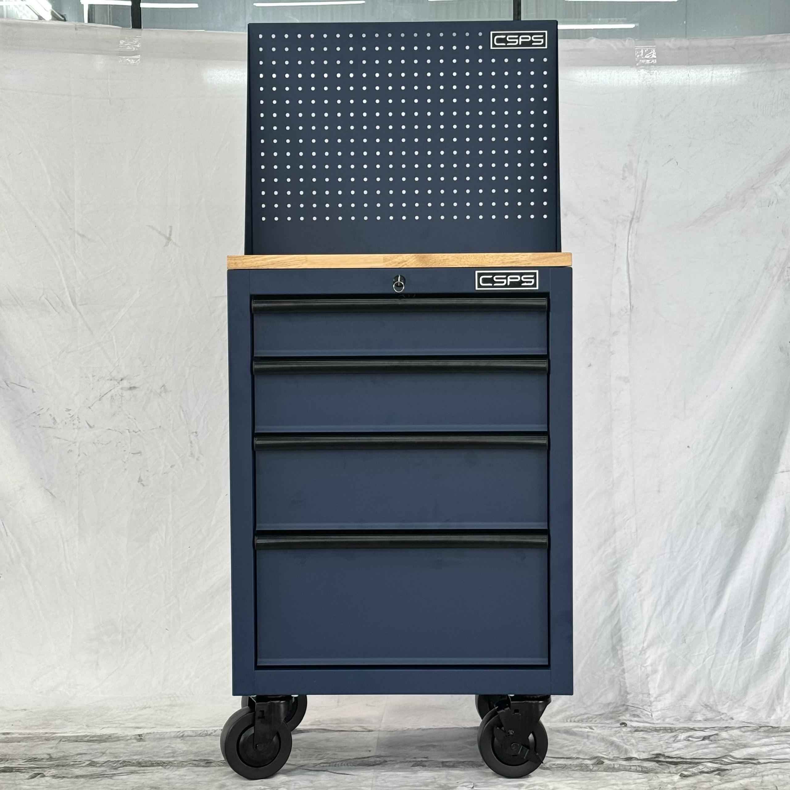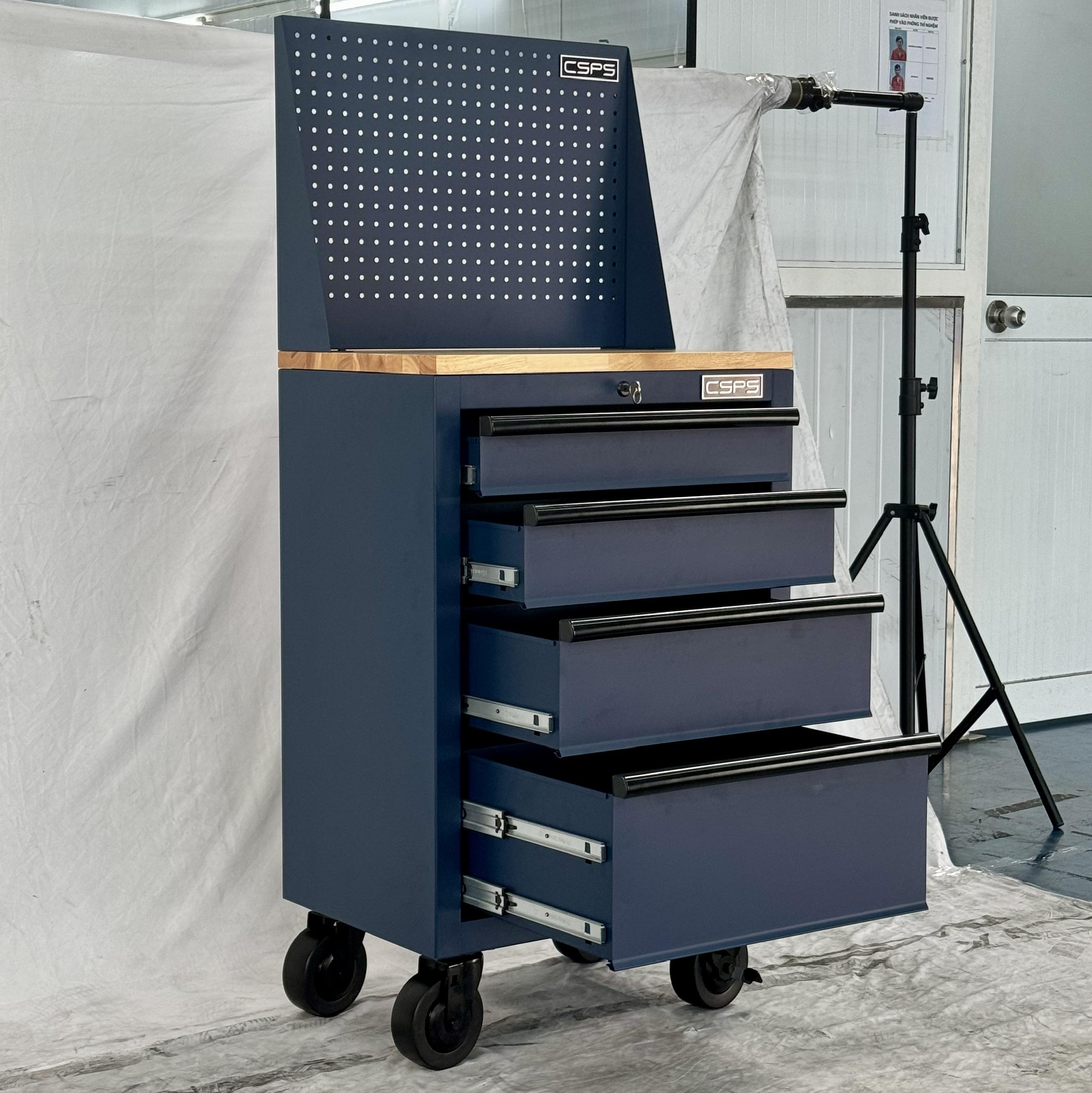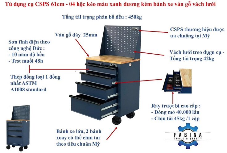 Tủ dụng cụ CSPS 61cm - 04 hộc kéo màu xanh dương kèm bánh xe ván gỗ vách lưới