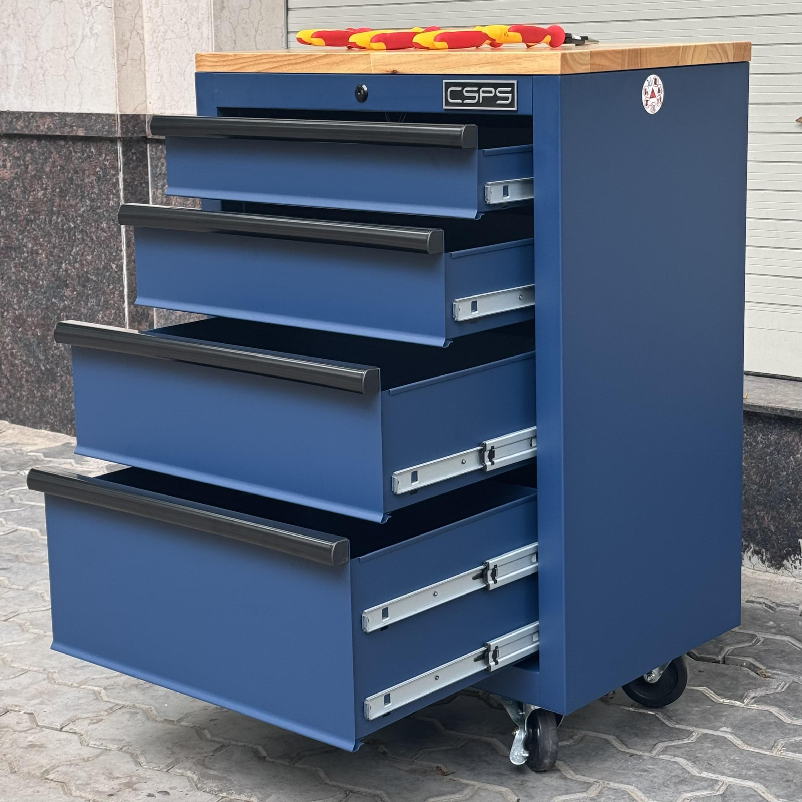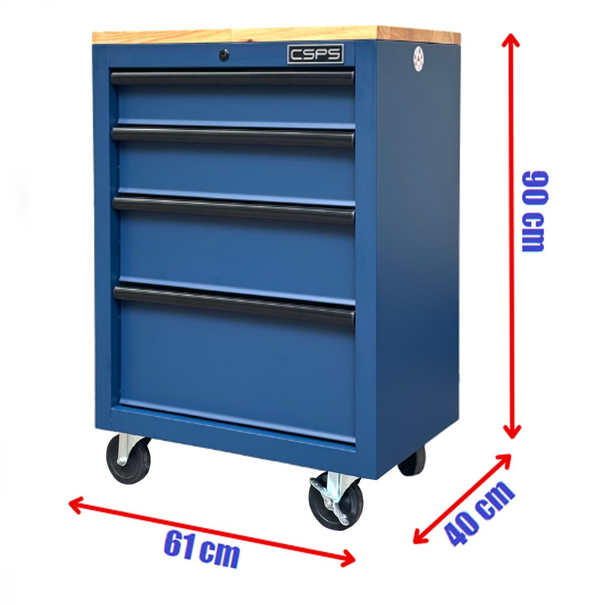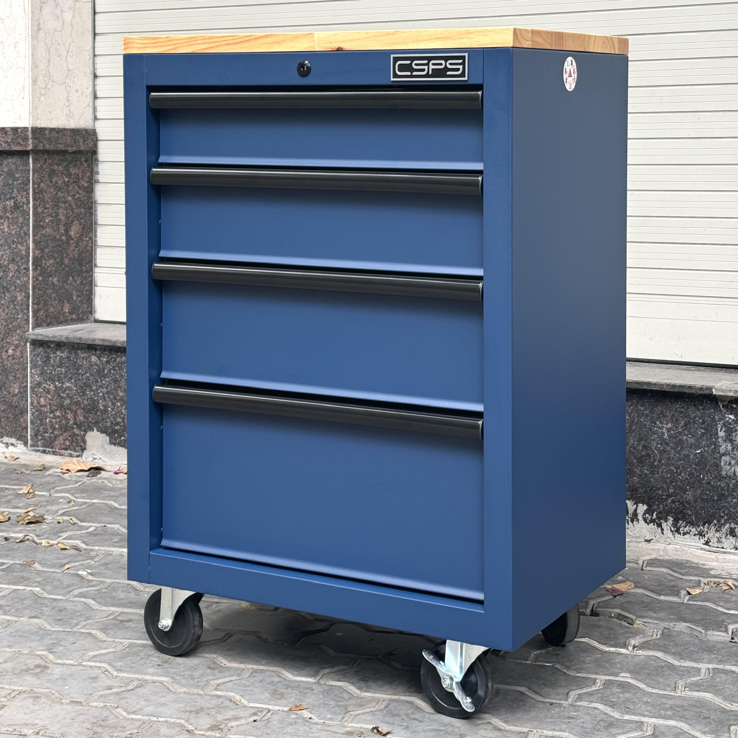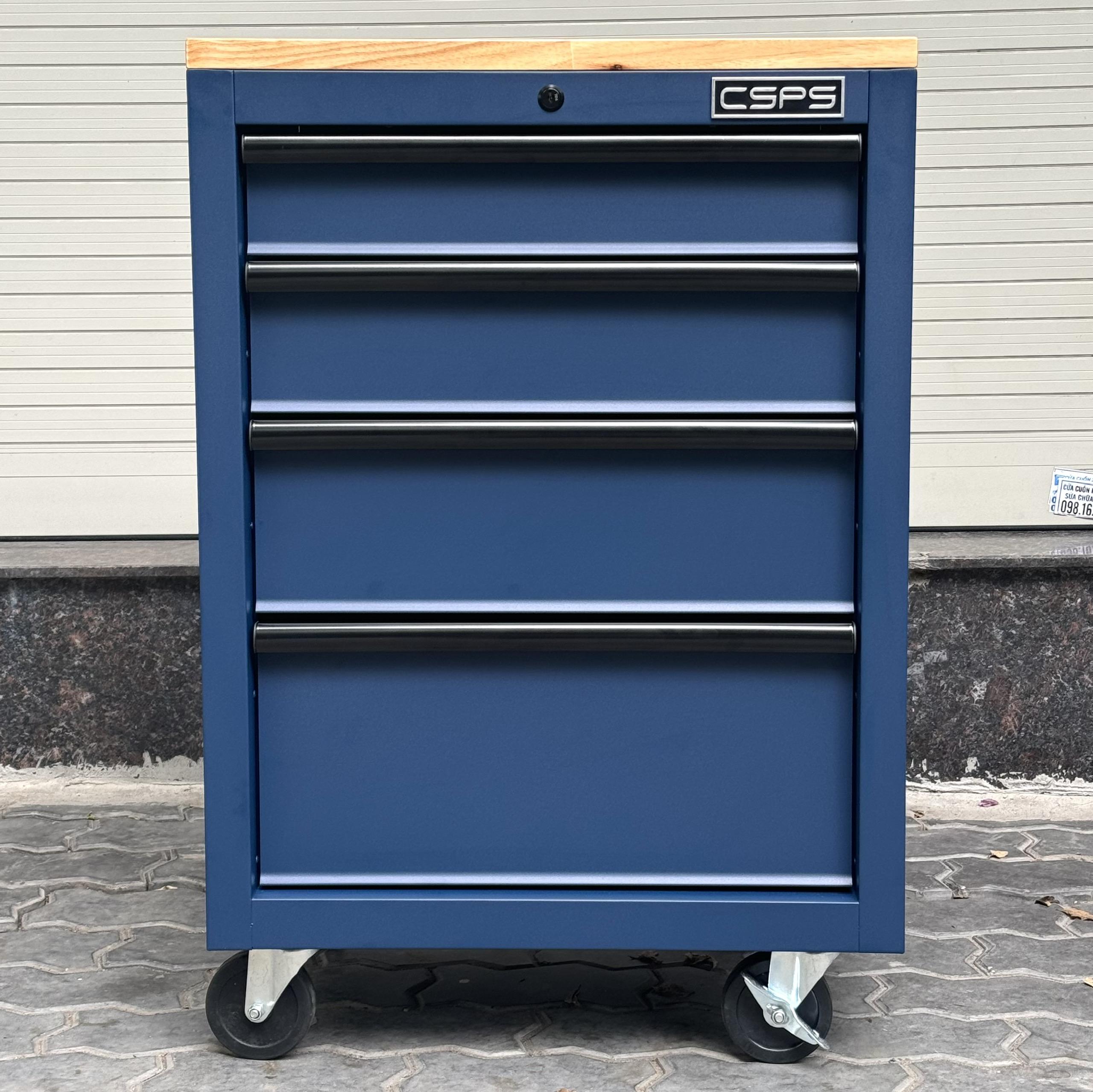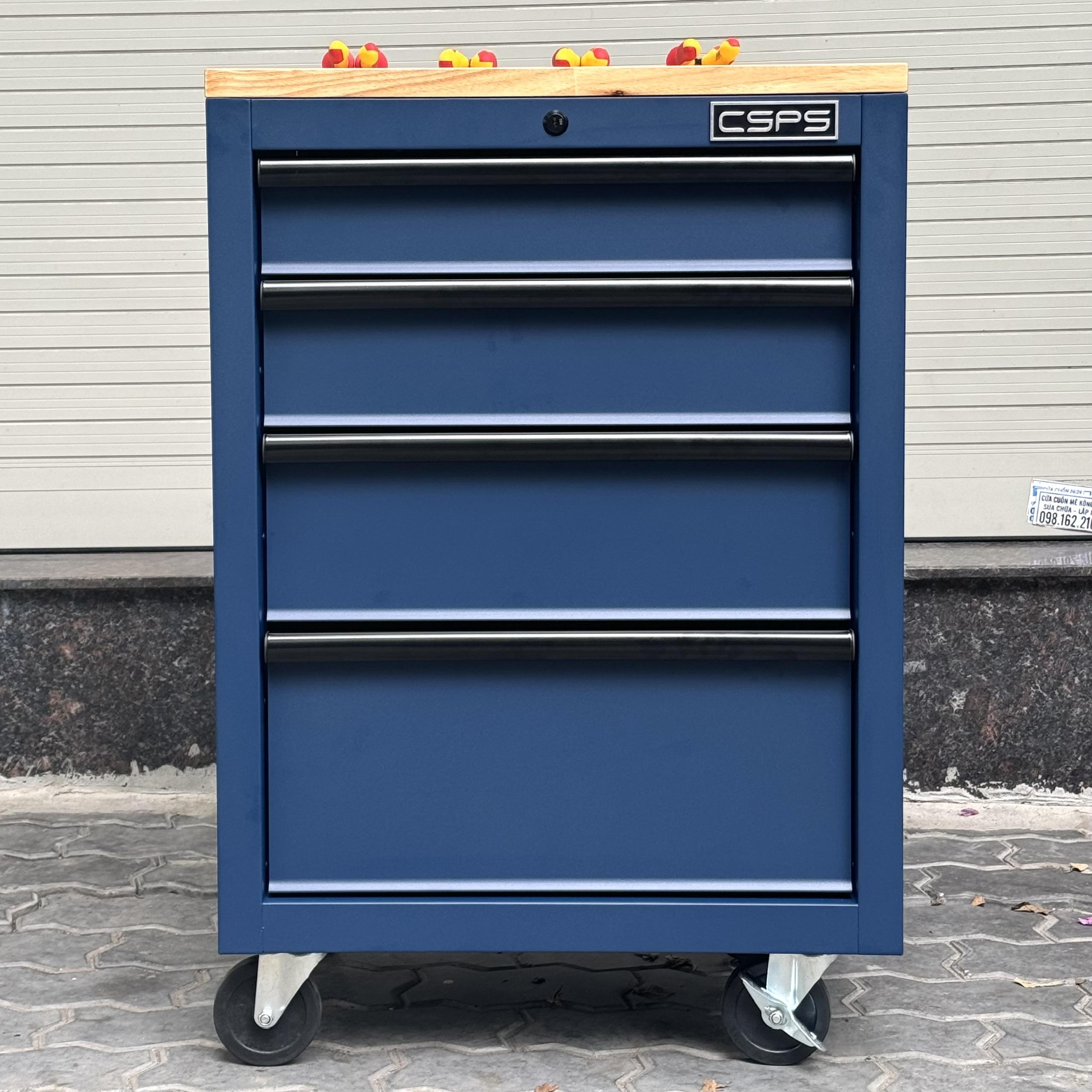 Tủ dụng cụ CSPS 61cm - 04 hộc kéo màu xanh dương mặt ván gỗ kèm bánh xe Fbn 12cm