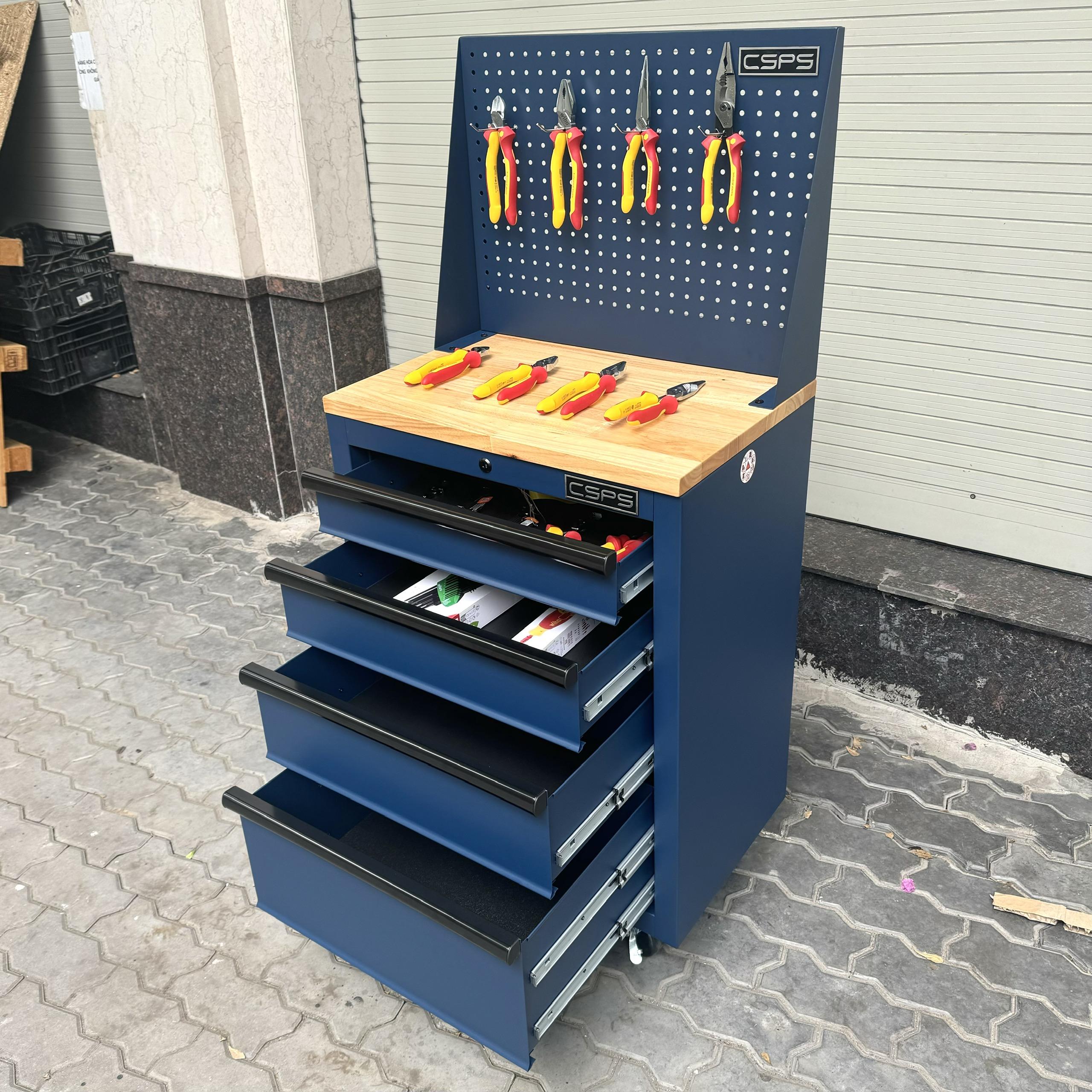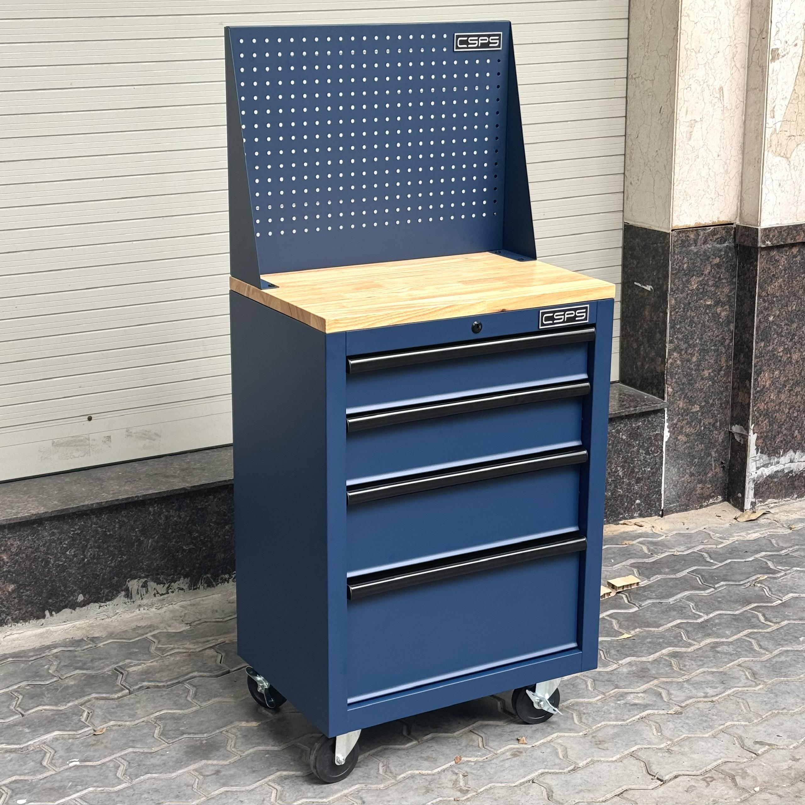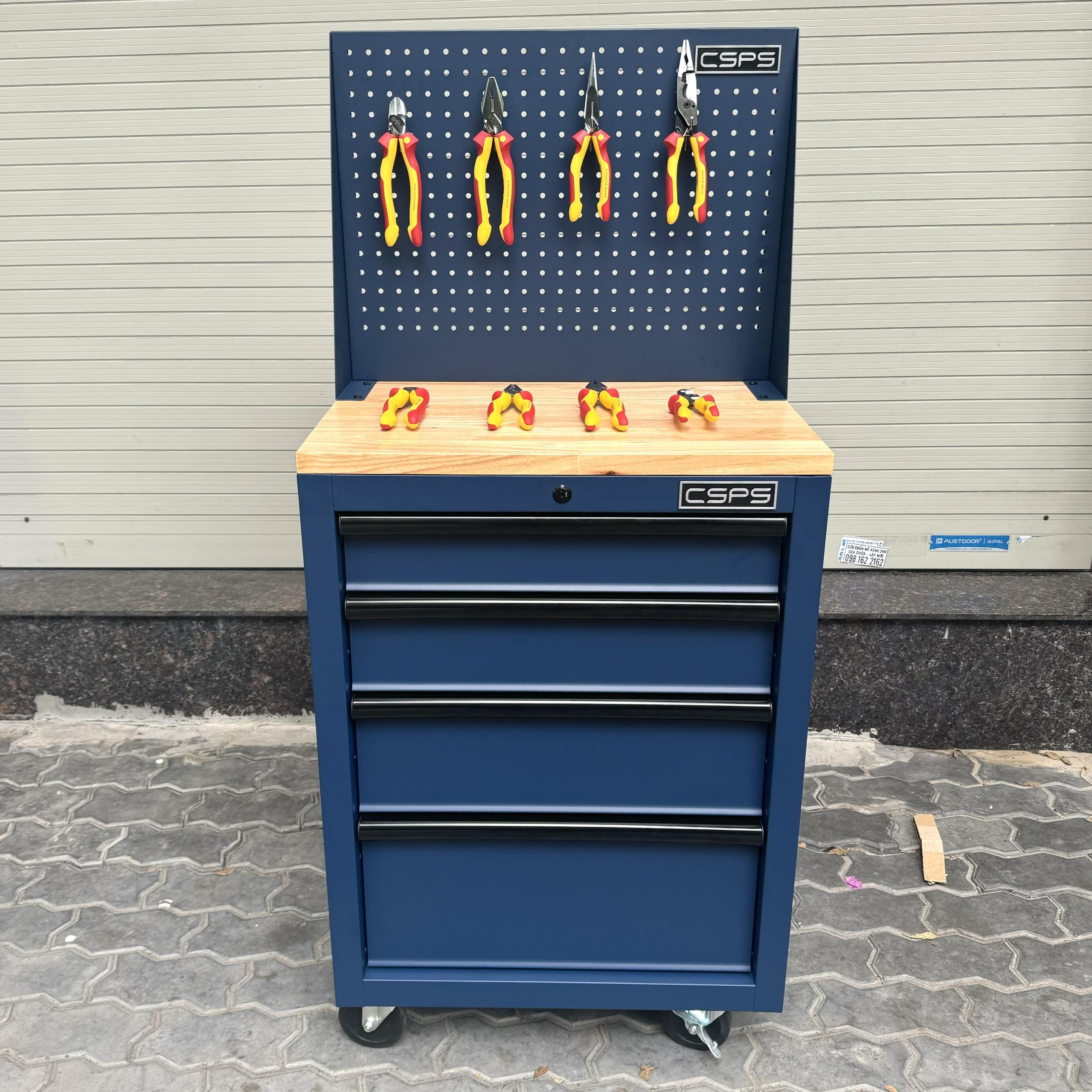 Tủ dụng cụ CSPS 61cm - 04 hộc kéo màu xanh dương mặt ván gỗ vách lưới kèm bánh xe Fbn 12cm