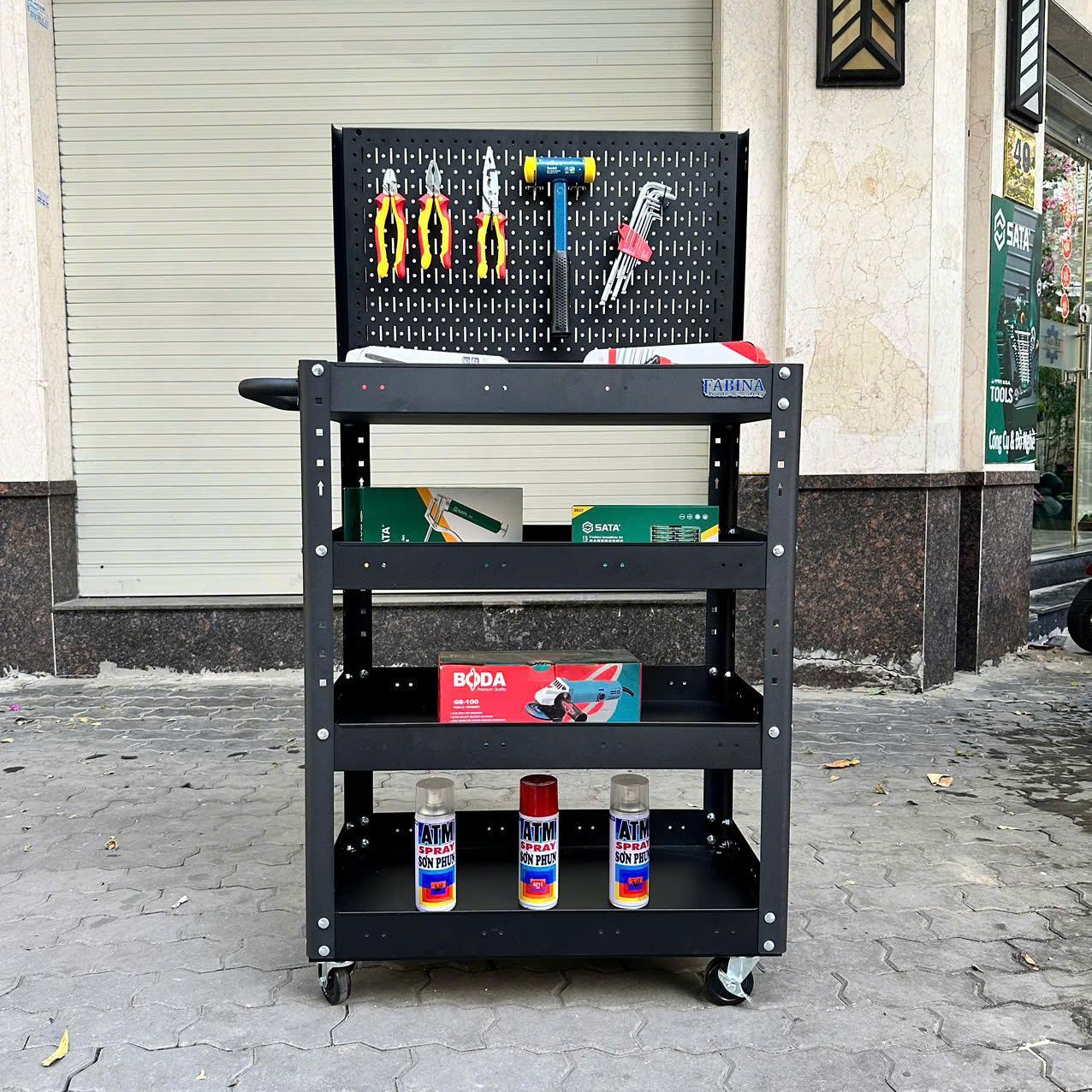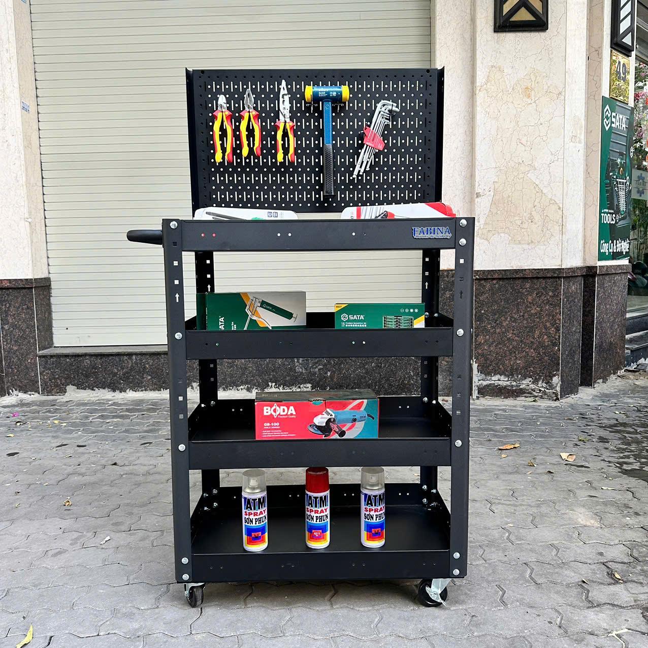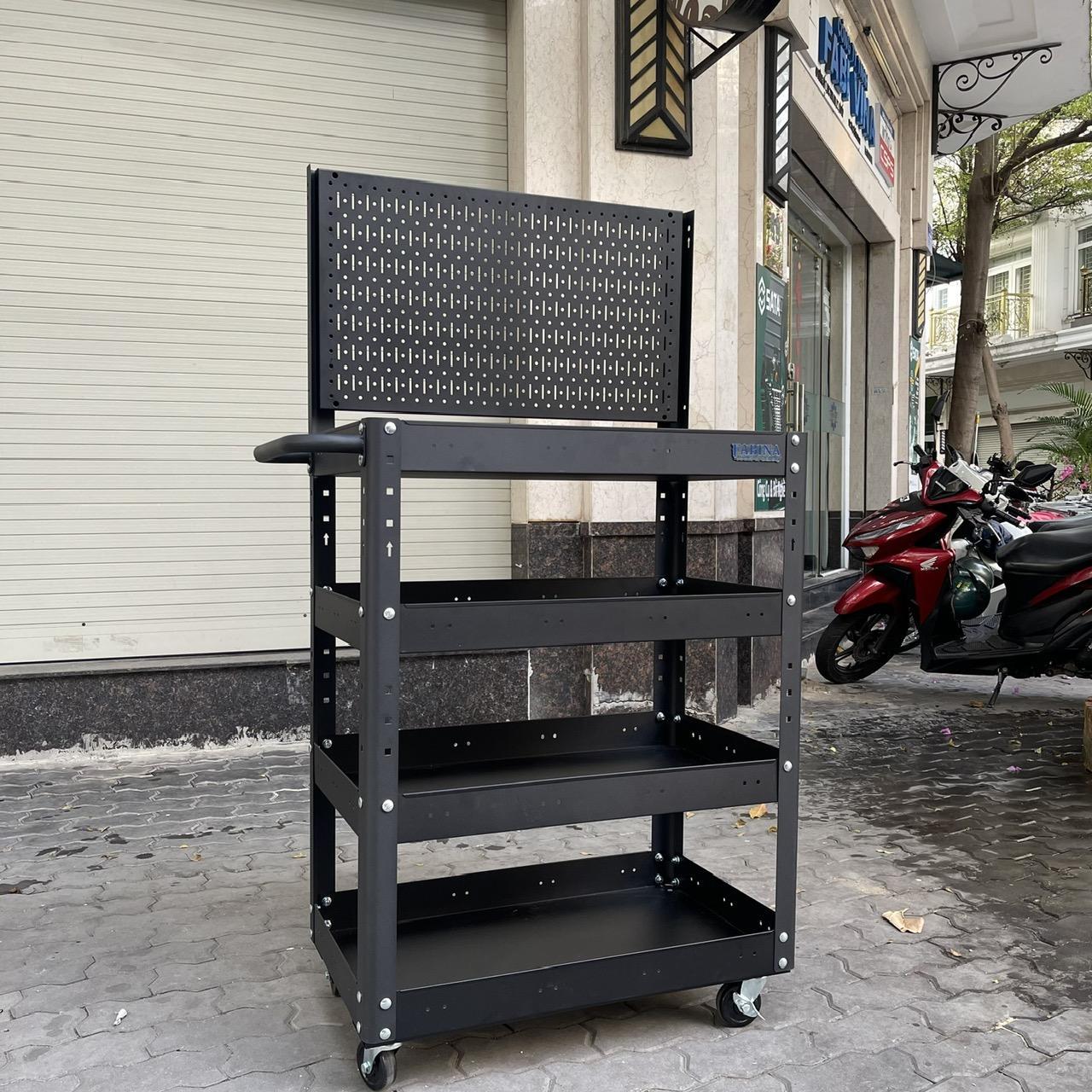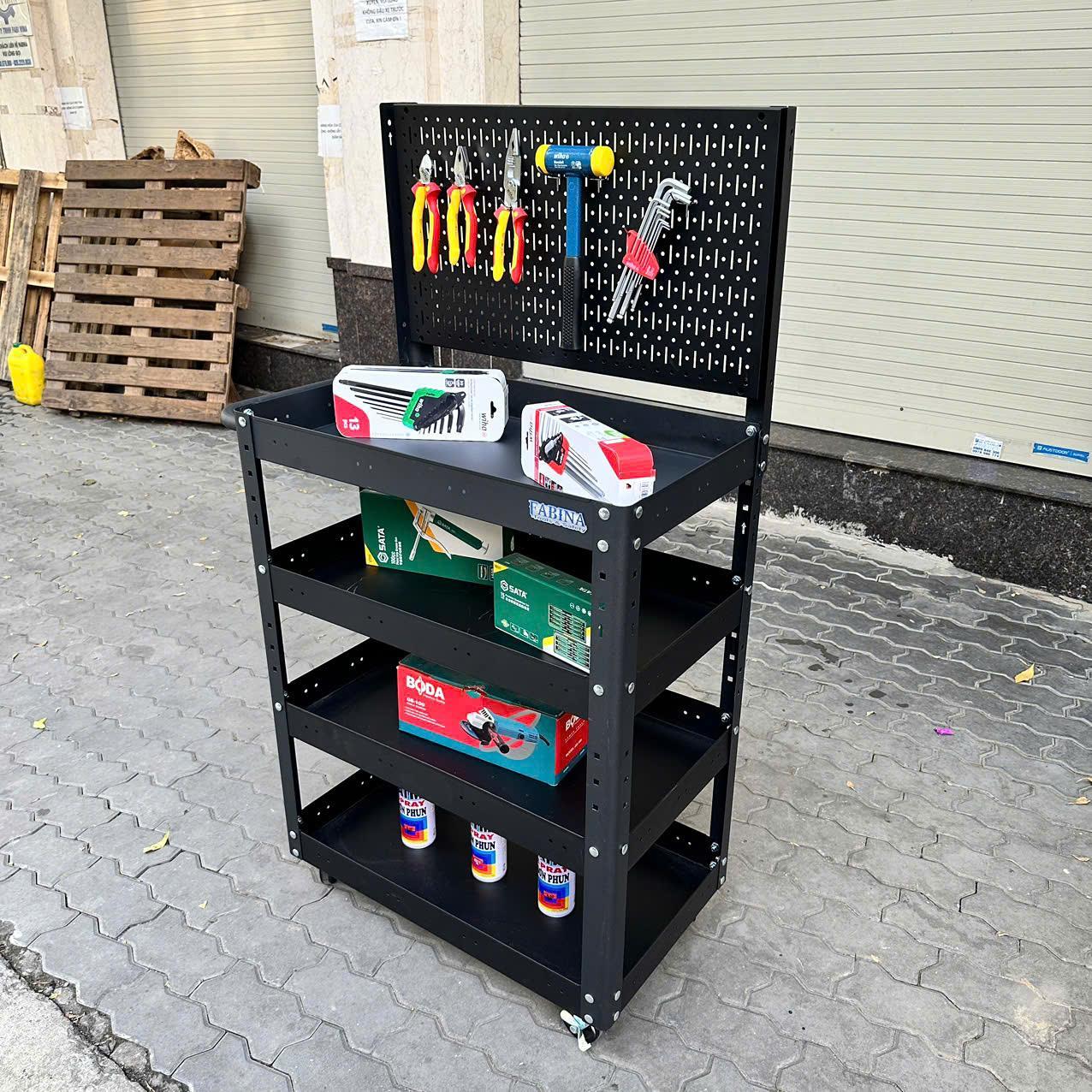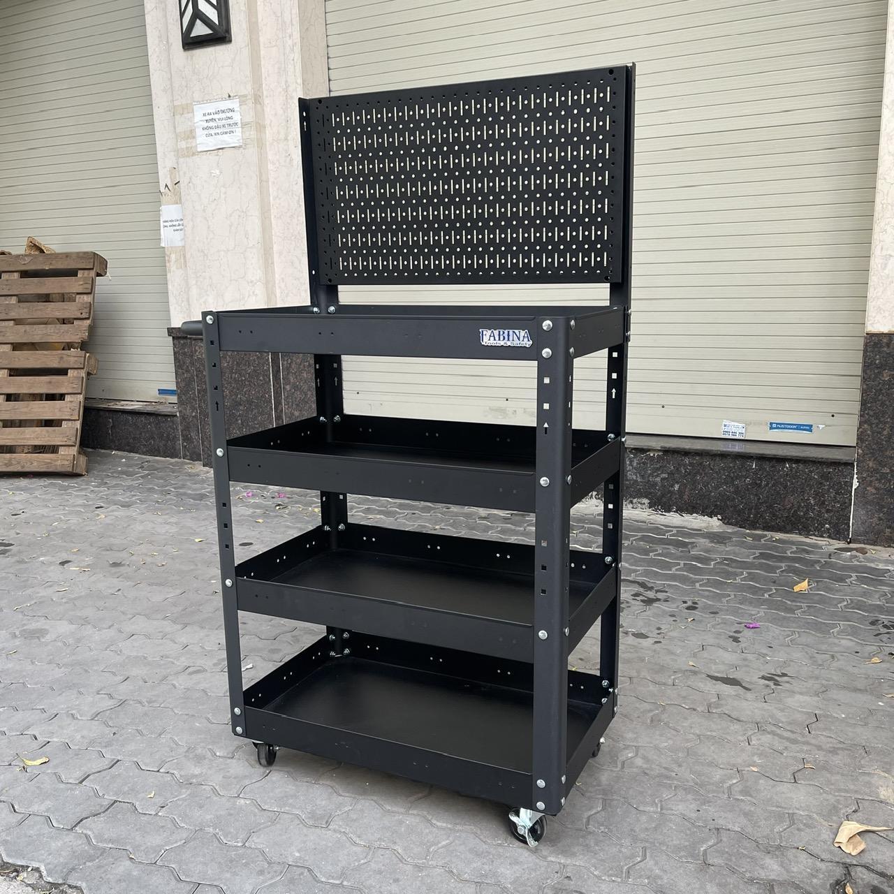 Xe đẩy 4 ngăn cao 980mm kèm vách lưới màu đen FABINA, Tiêu chuẩn Mỹ, sơn tĩnh điện, giúp bạn chứa dụng cụ và di chuyển dễ dàng trong quá trình làm việc, là một trang bị cần thiết cho nhà máy, garage, cửa hàng hay văn phòng làm việc.