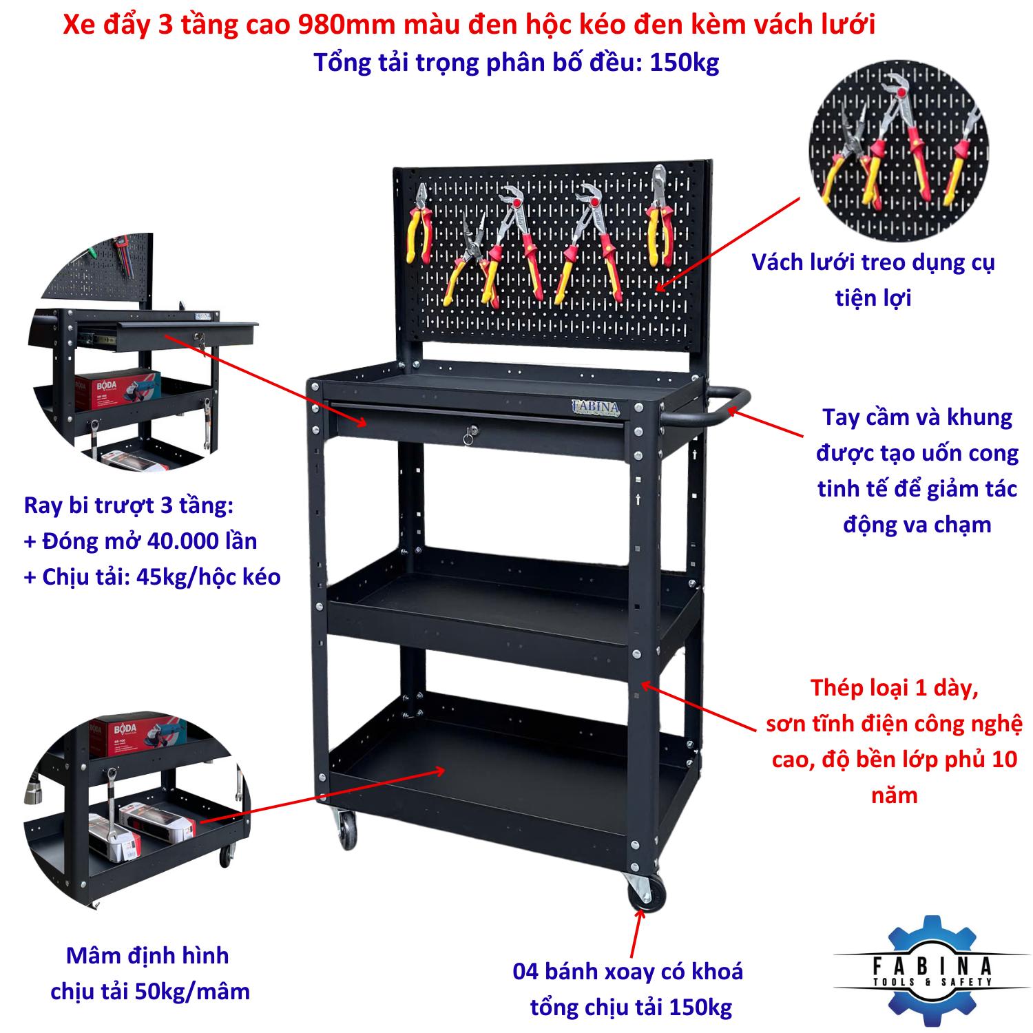 Xe đẩy 3 tầng cao 980mm màu đen hộc kéo đen kèm vách lưới